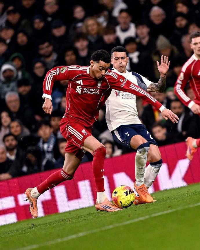 值得一提的是这场对决从一开始就充满火药味,双方攻防节奏明快。上半场前半段,利物浦与热刺互有攻防,范戴克的头球攻门被维卡里奥稳稳没收,热刺则凭借穆阿尼的头球接力考验了阿利松的防守。第30分钟,比赛迎来关键转折,哈维·西蒙斯在逼抢中蹬踏范戴克小腿,主裁判起初出示黄牌,经VAR介入复核后,主裁前往场边观看回放,最终在第33分钟改判直红,将哈维·西蒙斯罚下。少打一人的热刺不得不调整战术收缩防守,上半场双方0-0握手言和。